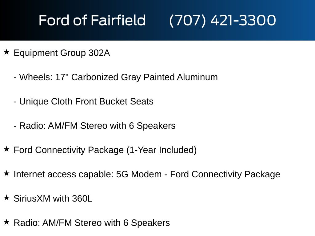 Equipment Group 302A, Ford Connectivity Package (1-Year Included), Internet access capable: 5G Modem - Ford Connectivity Package, Radio: AM/FM Stereo with 6 Speakers, SiriusXM with 360L, SYNC 4 with Enhanced Voice Recognition, Unique Cloth Front Bucket Seats, Wheels: 17" Carbonized Gray Painted Aluminum.