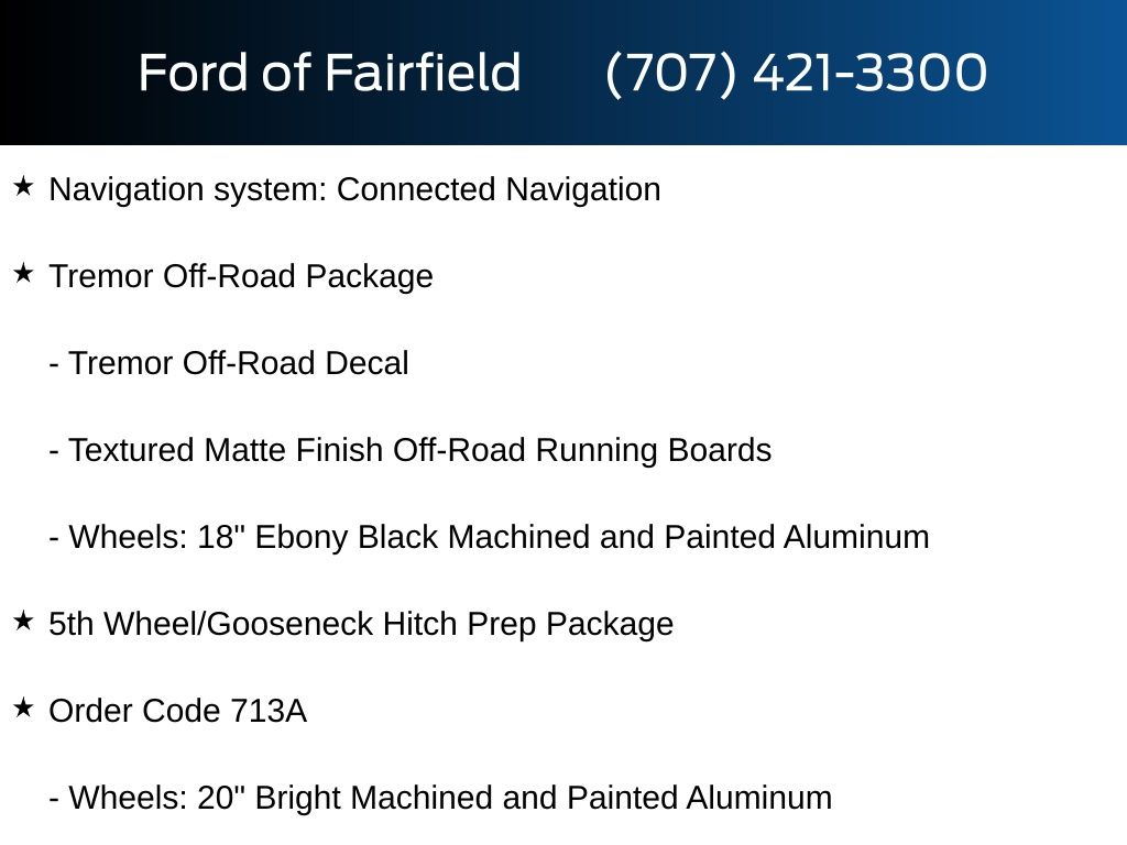 4WD, 5th Wheel/Gooseneck Hitch Prep Package, Navigation system: Connected Navigation, Order Code 713A, Textured Matte Finish Off-Road Running Boards, Tremor Off-Road Decal, Tremor Off-Road Package, Twin Panel Power Moonroof, Wheels: 18" Ebony Black Machined & Painted Aluminum.