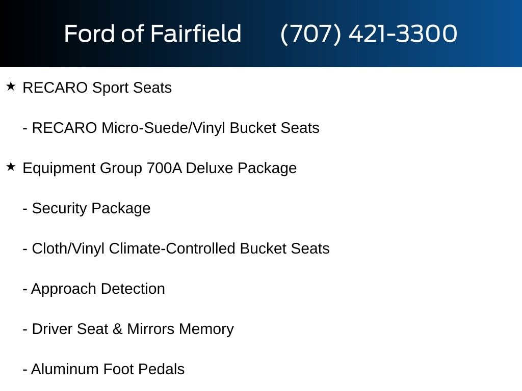 Active Anti-Theft System, Aluminum Foot Pedals, Approach Detection, Cloth/Vinyl Climate-Controlled Bucket Seats, Driver Seat & Mirrors Memory, Equipment Group 700A Deluxe Package, Locking Center Console, RECARO Micro-Suede/Vinyl Bucket Seats, RECARO Sport Seats, Security Package, Universal Garage Door Opener (UGDO), Wheel Locking Kit.