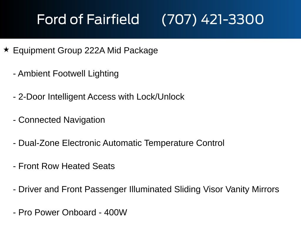 2-Door Intelligent Access with Lock/Unlock, AM/FM Stereo, Ambient Footwell Lighting, Cloth Bucket Seats, Connected Navigation, Driver and Front Passenger Illuminated Sliding Visor Vanity Mirrors, Dual Smart Charging USB Ports, Dual-Zone Electronic Automatic Temperature Control, Equipment Group 222A Mid Package, Ford Connectivity Package (1-Year Included), Front Row Heated Seats, Pro Power Onboard - 400W, Rear Parking Sensors, SiriusXM with 360L, SYNC 4, Wheels: 17" Carbonized Gray-Painted Aluminum.
