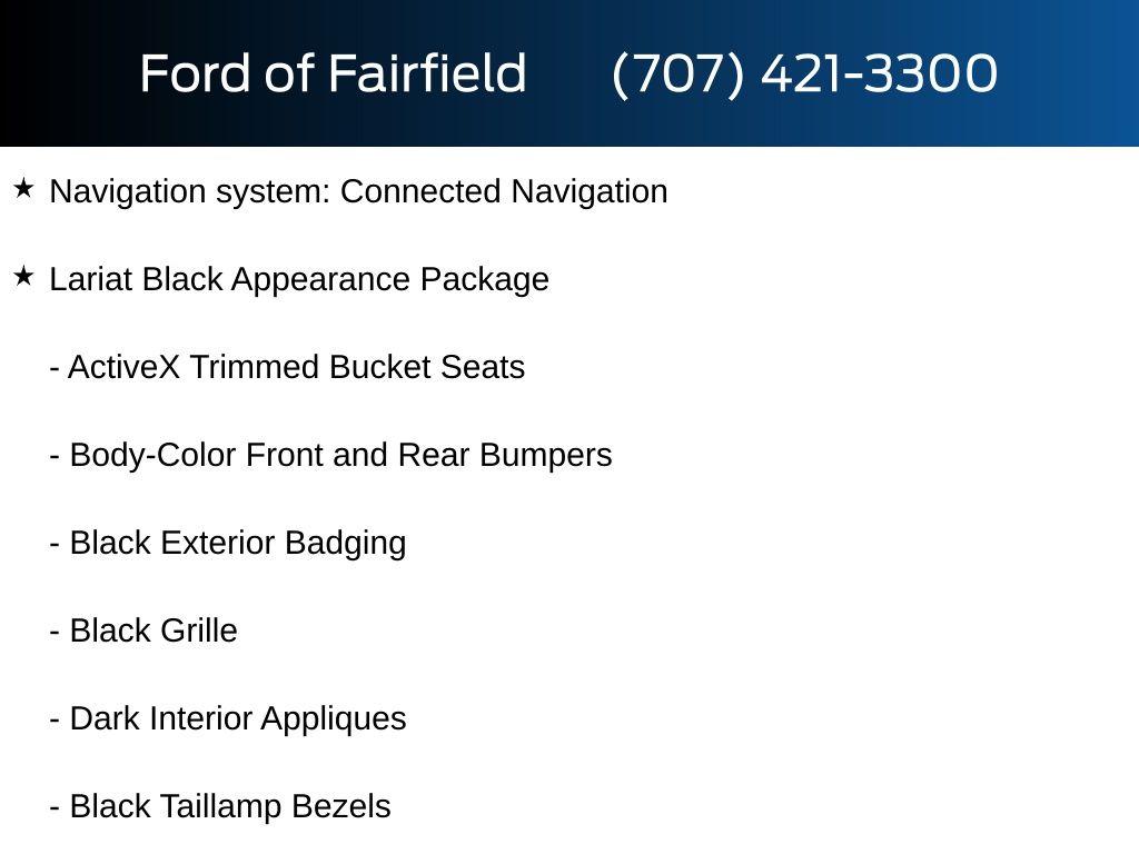 3.5L PowerBoost Full-Hybrid V6, 4WD, 4 Pickup Box Tie-Down Plates, 4x4 FX4 Off-Road Bodyside Decal, 6" Angular Bright Anodized Step Bar, ActiveX Trimmed Bucket Seats, Bed Storage Boxes, Bed Utility Package, Black Exterior Badging, Black Grille, Black Taillamp Bezels, Body-Color Front and Rear Bumpers, Dark Interior Appliques, Electronic Locking with 3.31 Axle Ratio, Equipment Group 501A Mid, Ford Connectivity Package (1-Year Included), FX4 Off-Road Package, Gray Box Side Decal, Hill Descent Control, Illuminated Driver and Passenger Visors, Internet access capable: 5G Modem - Ford Connectivity Package, Lariat Black Appearance Package, LED Box Lighting, Matte Black Tailgate F-150 Decal, Monotube Rear Shocks, Navigation system: Connected Navigation, Off-Road Tuned Front Shock Absorbers, Power-Adjustable Pedals with Memory, Power-Sliding Rear Window, Radio: B&O Sound System by Bang and Olufsen, Rock Crawl Mode, SYNC 4 with Enhanced Voice Recognition, Tailgate Step with Work Surface, Tray Style Floor Liner Without Carpet Mats, Twin Panel Moonroof, Wheels: 20" Chrome-Like PVD.