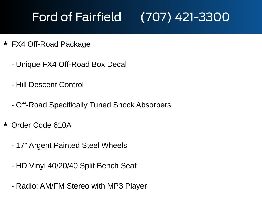4WD, 17" Argent Painted Steel Wheels, 3.73 Axle Ratio, Bright Chrome Hub Covers and Center Ornaments, Chrome Front Bumper, Chrome Rear Step Bumper, Ford Connectivity Package (1-Year Included), FX4 Off-Road Package, Halogen Fog Lamps, HD Vinyl 40/20/40 Split Bench Seat, Hill Descent Control, Internet access capable: 5G Modem - Ford Connectivity Package, Off-Road Specifically Tuned Shock Absorbers, Order Code 610A, Radio: AM/FM Stereo with MP3 Player, SYNC 4, Unique FX4 Off-Road Box Decal, XL Chrome Package.