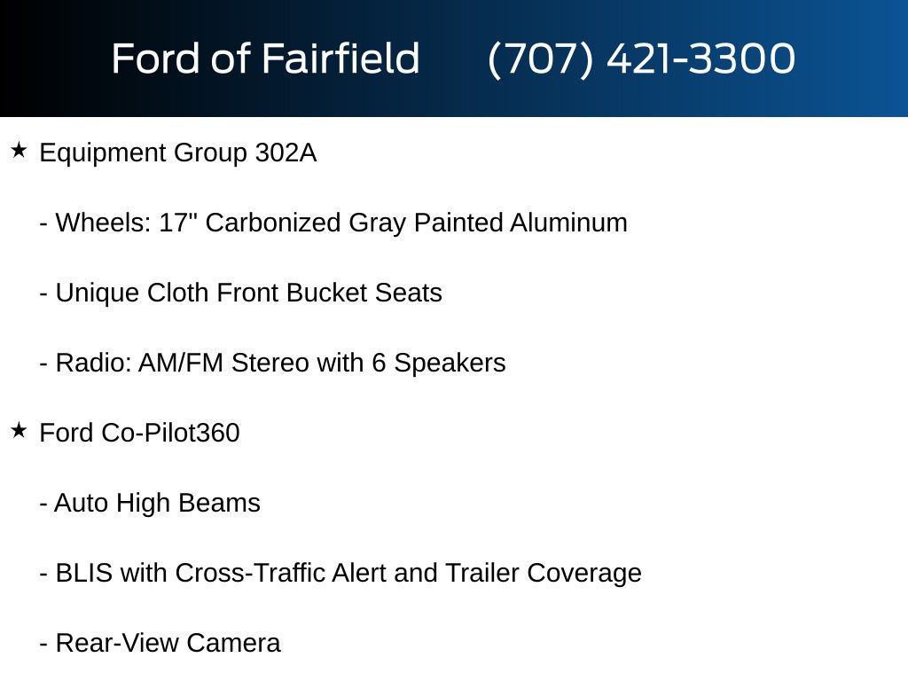 Auto High Beams, BLIS with Cross-Traffic Alert and Trailer Coverage, Equipment Group 302A, Exit Warning, Ford Co-Pilot360, Ford Connectivity Package (1-Year Included), Internet access capable: 5G Modem - Ford Connectivity Package, Intersection Assist, Lane-Keeping System, Power Glass Manual-Folding Mirrors, Pre-Collision Assist with Automatic Emergency Braking, Radio: AM/FM Stereo with 6 Speakers, Rear Cross Traffic Braking, Rear Parking Sensors, Rear-View Camera, SiriusXM with 360L, SYNC 4 with Enhanced Voice Recognition, Unique Cloth Front Bucket Seats, Wheels: 17" Carbonized Gray Painted Aluminum.